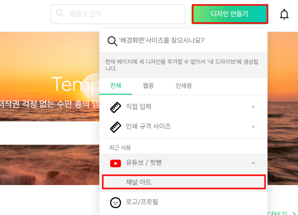 나오는 팝업메뉴에서 유튜브를 클릭하면 채널아트가 바로 나오고 선택