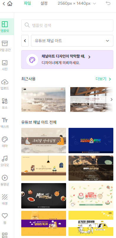 채널아트의 템플렛이 화면 좌측에 펼쳐진다.