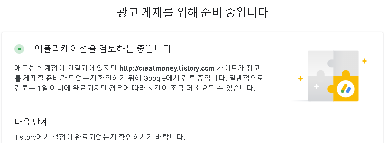 위의 말대로 애드센스에 들어가 '사이트'클릭해보니 요렇게 검토중이라는 말이 또...