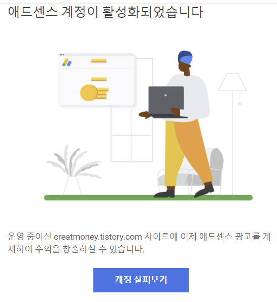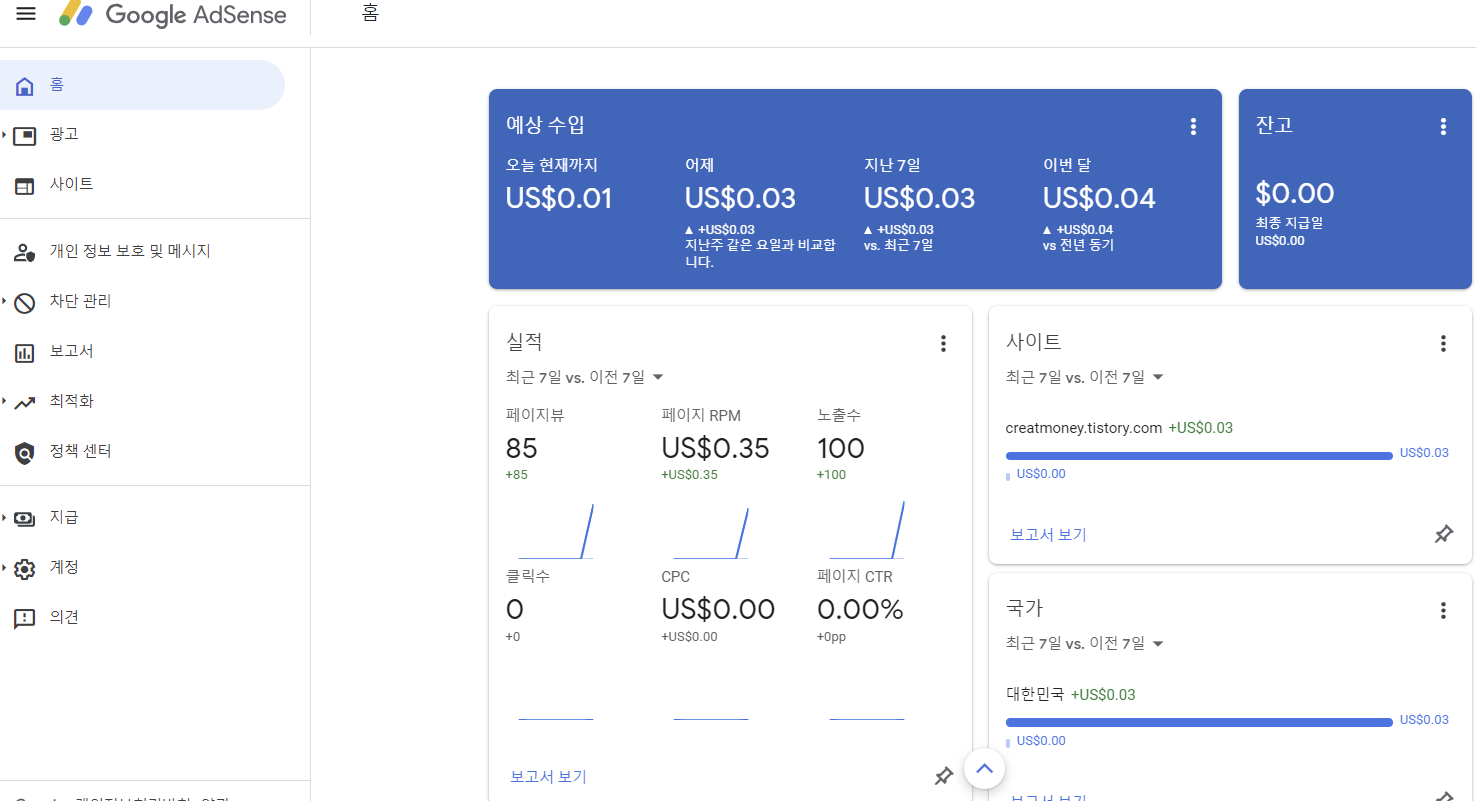 애드센스에 접속하니 홈화면부터 달라졌다. 그새 0.35불 붙었네. ㅎㅎ