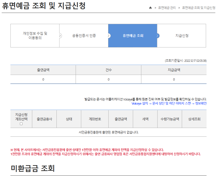 저는 휴면예금이 없다보니 현재 잔액이 0으로 나오네요.